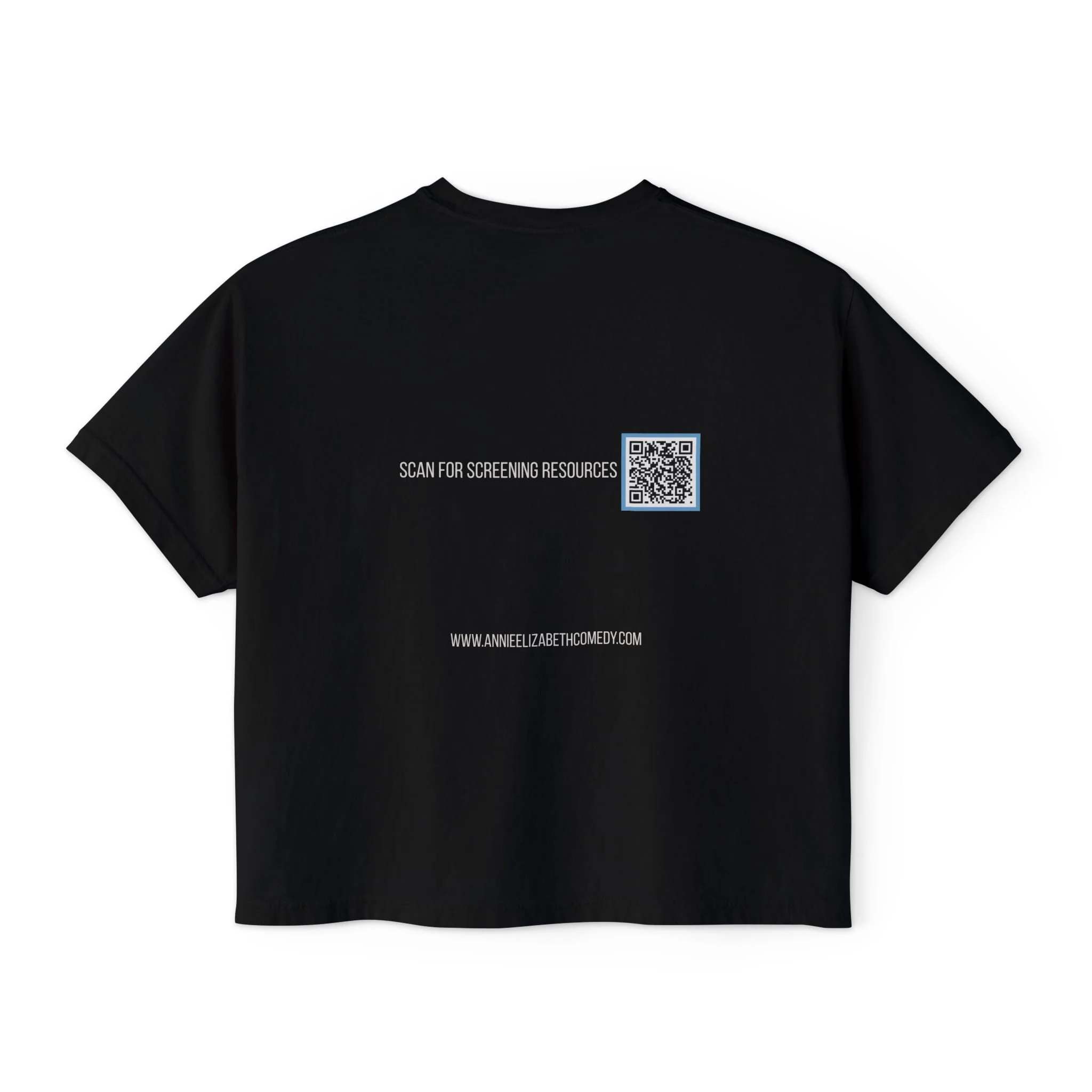 A soft, structured boxy tee designed to start conversations and raise awareness. The cropped, wide silhouette drapes comfortably while the heavy ring-spun cotton gives the shirt a substantial, vintage feel. Front artwork uses clear, confident messaging framed by a subtle blue graphic; the back includes a discreet QR code to link wearers with screening resources. Wear this when you want to be seen, spark dialogue, and offer practical help to people who might need it.